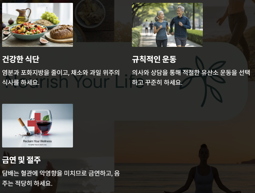 | 건강한 식단 | 염분과 포화지방을 줄이고, 채소와 과일 위주의 식사를 하세요. |