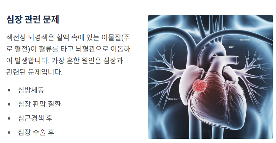 | 색전성 뇌경색 | 심장 또는 다른 부위에서 발생한 혈전이 혈류를 통해 뇌혈관으로 이동하여 막히는 경우로, 주로 심방세동과 같은 심장 질환이 원인입니다. |