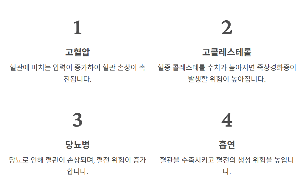 | 고혈압 | 혈관에 미치는 압력이 증가하여 혈관 손상이 촉진됩니다. |
