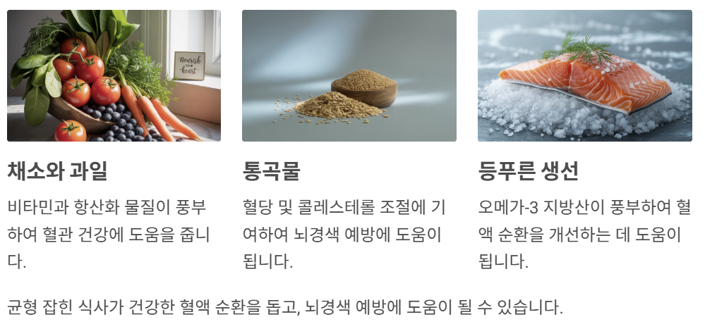 이러한 식품을 포함한 균형 잡힌 식사가 건강한 혈액 순환을 돕고, 뇌경색 예방에 도움이 될 수 있습니다