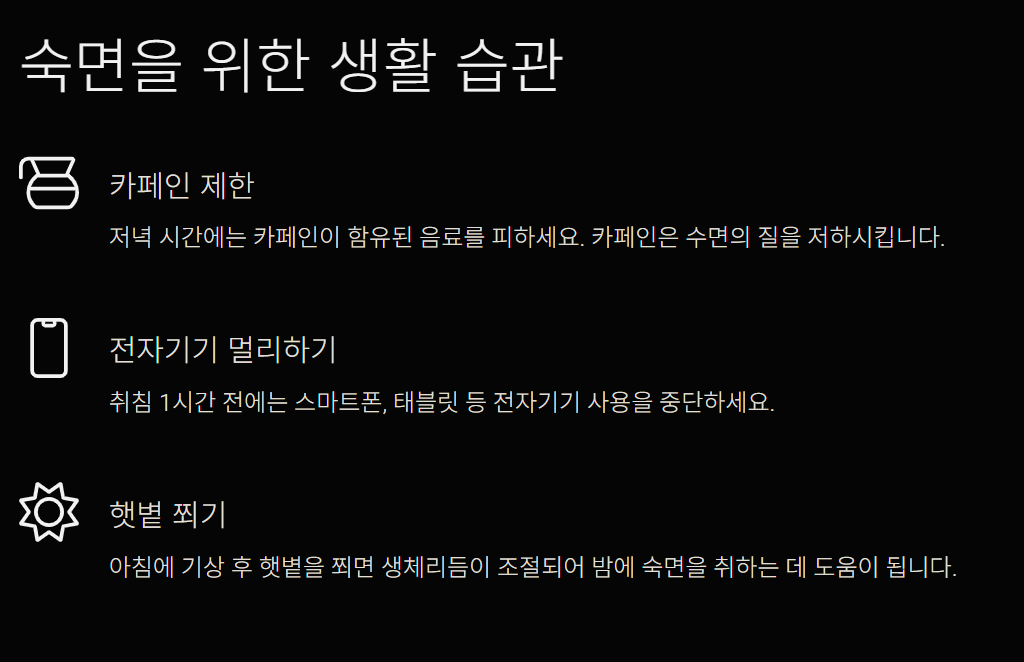 | 숙면 | 카페인 제한, 전자기기 멀리하기 |