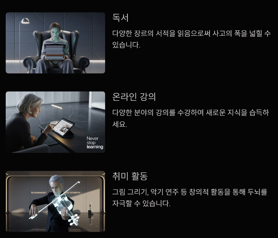 | 평생 학습 | 책 읽기, 강의 참여 등 지적 자극 지속 |