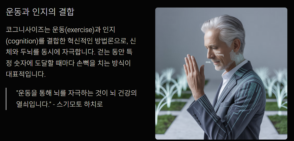 코그니사이즈는 운동(exercise)과 인지(cognition)를 결합한 혁신적인 방법론으로, 단순한 신체 활동 이상의 효과를 가져옵니다. 대표적으로 걷는 동안 특정 숫자에 도달할 때마다 손뼉을 치는 방식과 같이 신체와 두뇌를 동시에 자극하는 이 운동은 특히 경도 인지 장애 예방에 효과적입니다. 스기모토 박사에 따르면, 이와 같은 활동은 뇌의 집중력을 높여 인지 기능을 더욱 활성화하는 데 기여합니다.