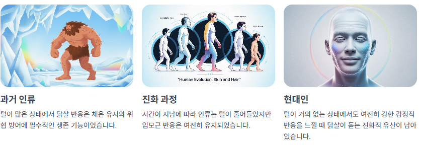 인간의 몸은 놀라운 생리적 반응을 통해 환경에 적응해 왔습니다. 그 중 하나인 닭살은 과거 인류의 생존 본능과 깊은 연관이 있습니다. 이번 섹션에서는 닭살의 기전과 그 진화적 배경을 살펴보겠습니다.