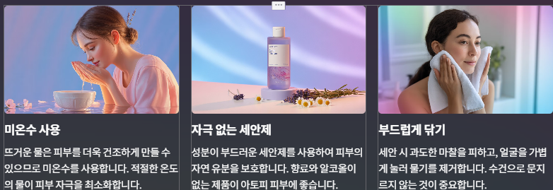 - 미온수 사용: 뜨거운 물은 피부를 더욱 건조하게 만들 수 있으므로 미온수를 사용합니다.