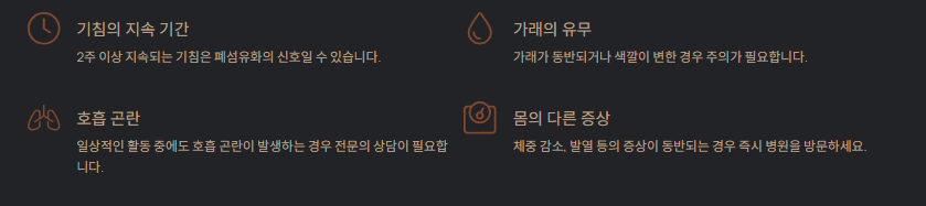 | 기침 지속 | 2주 이상 지속되는 기침은 주의가 필요합니다. |