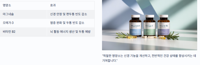 | 마그네슘 | 신경 안정 및 편두통 빈도 감소 |