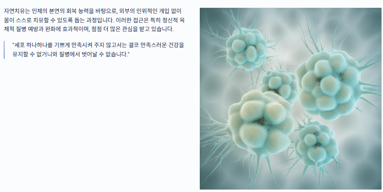 이처럼, 자연치유는 단순한 치료가 아닌 몸과 마음의 균형을 이루며 건강을 회복하는 중요한 방법입니다. 사회적 지지와 함께 개인의 노력이 모여 지속 가능한 건강을 이룰 수 있습니다.