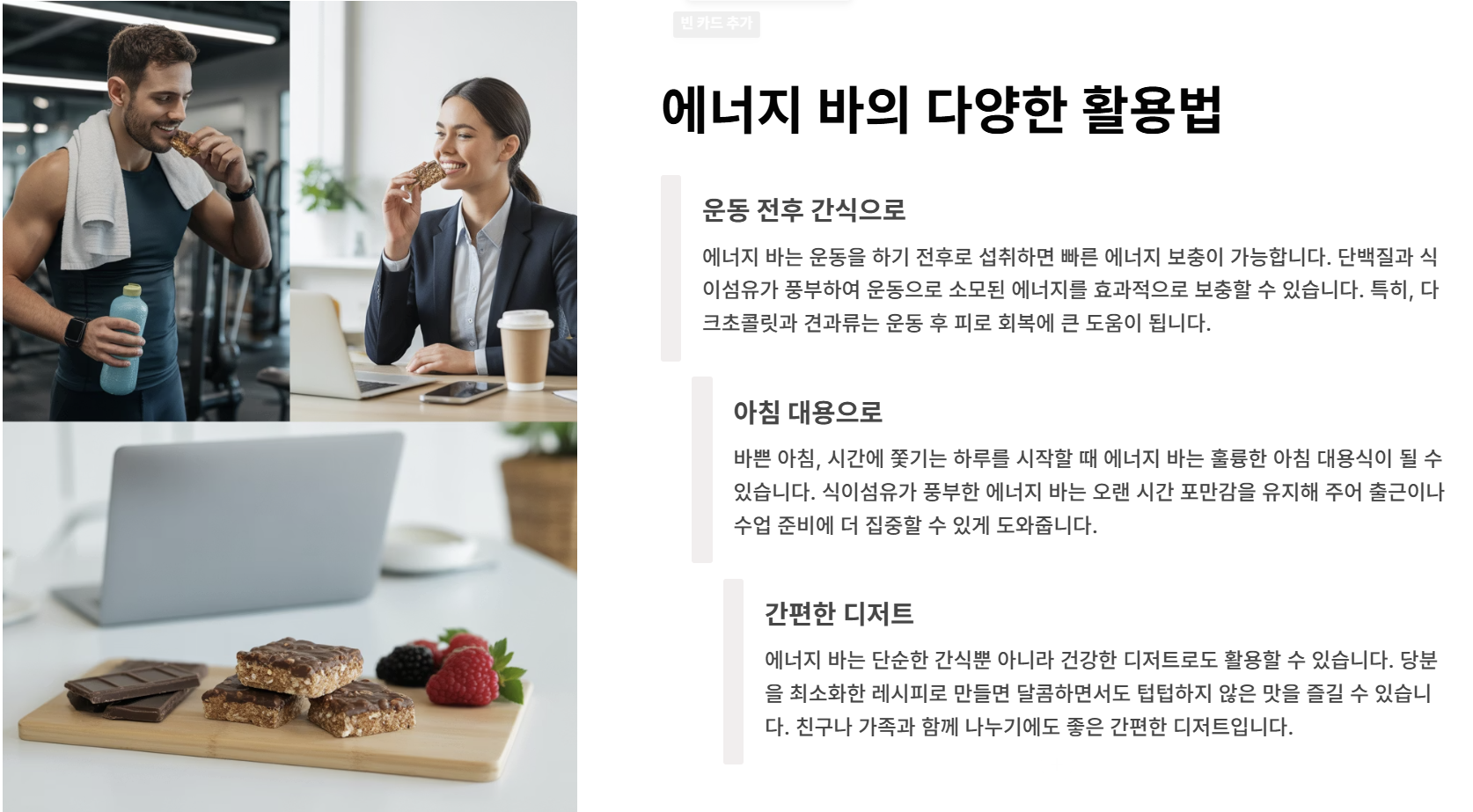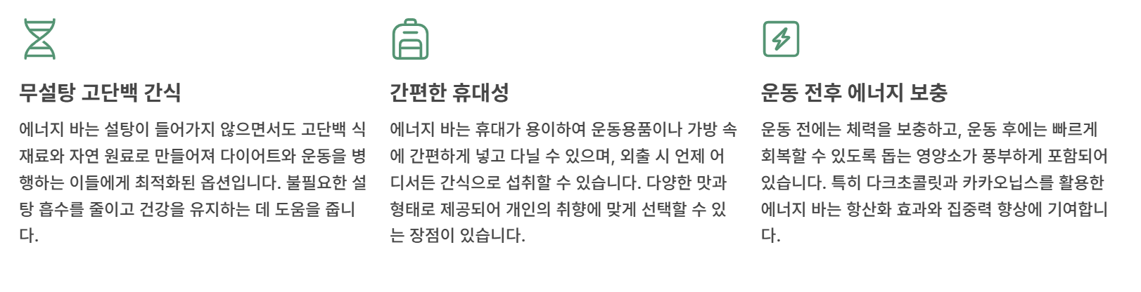 이처럼 에너지 바는 맛과 영양을 모두 충족시키며, 건강한 라이프스타일을 추구하는 사람들에게 이상적인 선택으로 자리 잡고 있습니다. 건강과 함께 맛도 챙기고 싶다면, 오늘부터 에너지 바를 일상의 일부분으로 만들어보세요!
