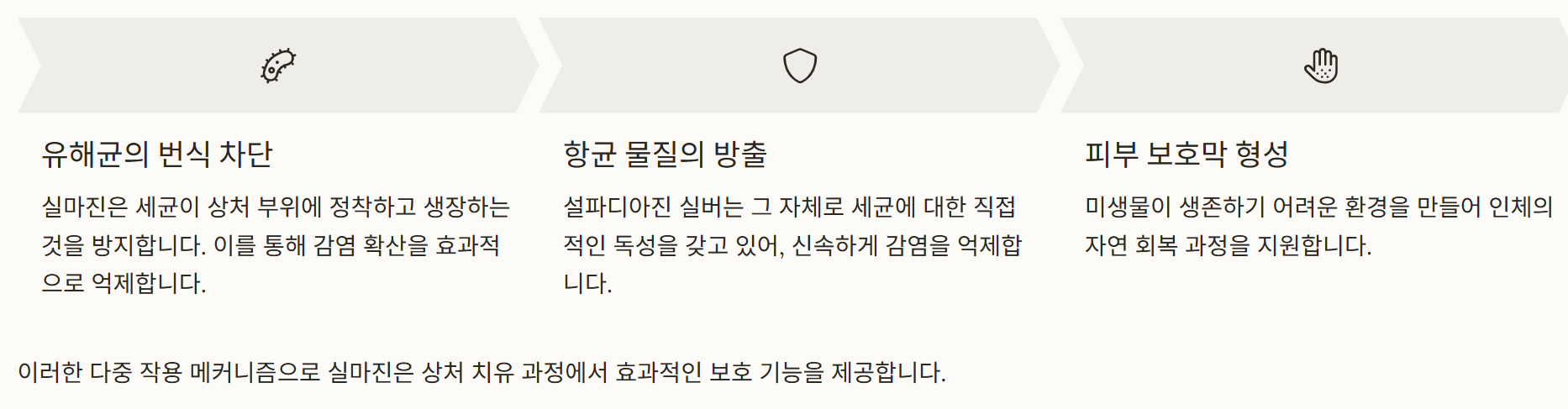 - 유해균의 번식 차단: 실마진은 세균이 상처 부위에 정착하고 생장하는 것을 방지합니다.