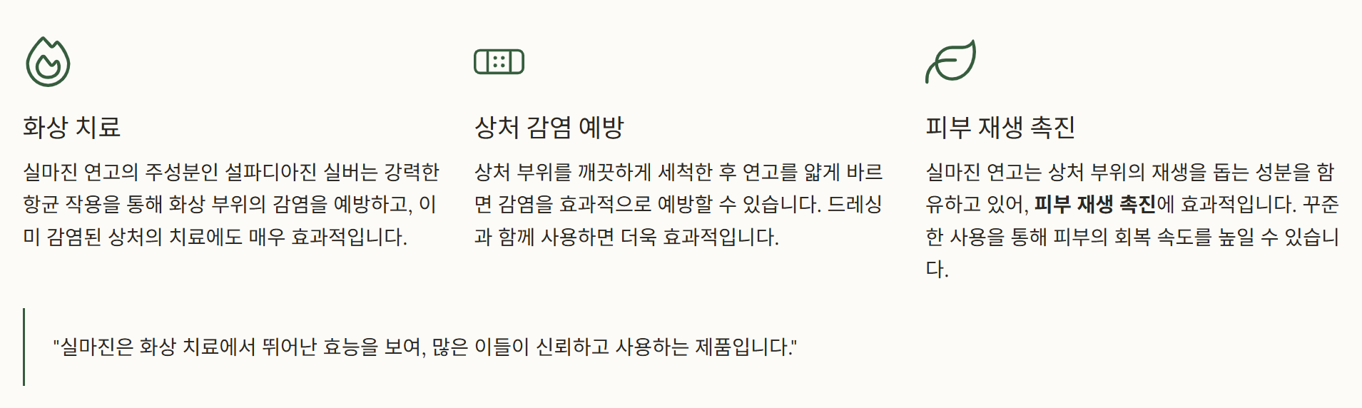 "실마진은 화상 치료에서 뛰어난 효능을 보여, 많은 이들이 신뢰하고 사용하는 제품입니다."