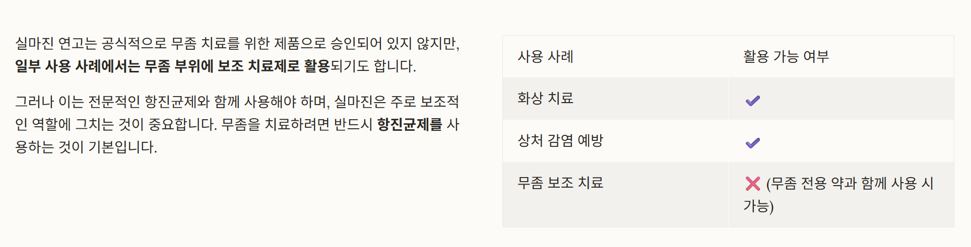 | 무좀 보조 치료 | ❌ (무좀 전용 약과 함께 사용 시 가능) |