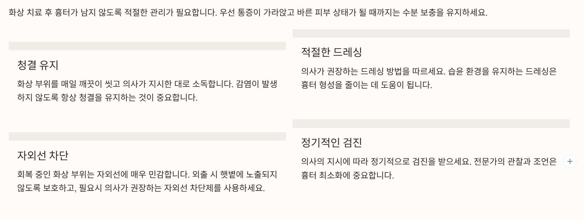 - 전문가 치료: 화상이 심각한 경우, 화상 전문의의 진료를 받아 치료 계획을 세워야 합니다. 피부 이식이나 추가적인 치료가 필요할 수도 있습니다.