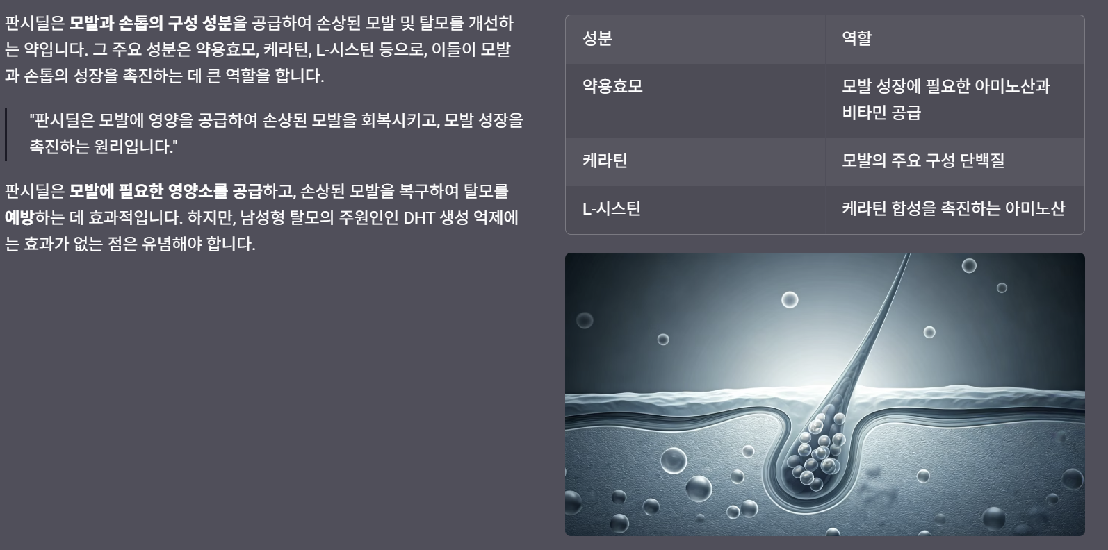 "판시딜은 모발에 영양을 공급하여 손상된 모발을 회복시키고, 모발 성장을 촉진하는 원리입니다."