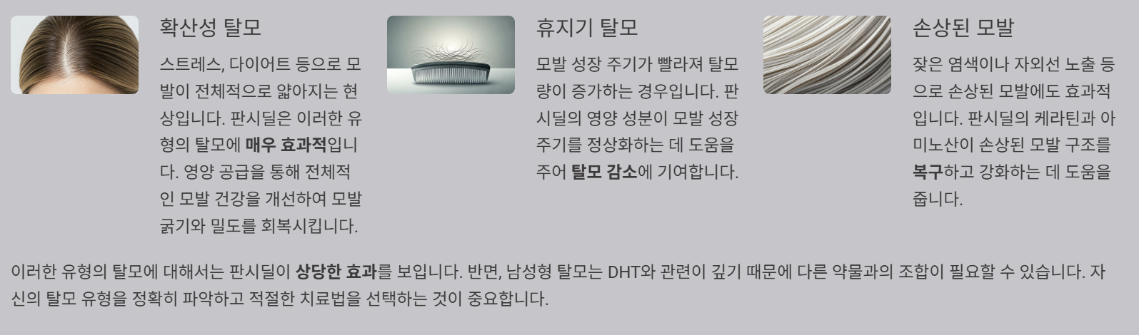 이러한 유형의 탈모에 대해서는 판시딜이 상당한 효과를 보입니다. 반면, 남성형 탈모는 DHT와 관련이 깊기 때문에 다른 약물과의 조합이 필요할 수 있습니다.