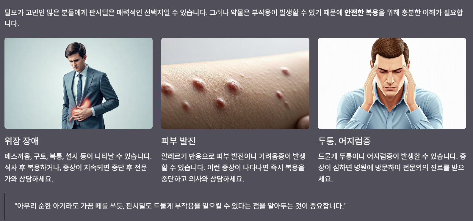 탈모가 고민인 많은 분들에게 판시딜은 매력적인 선택지일 수 있습니다. 그러나 약물은 부작용이 발생할 수 있기 때문에 안전한 복용을 위해 충분한 이해가 필요합니다. 아래에서 판시딜의 주요 부작용과 대처 방법, 그리고 안전한 사용을 위한 조언을 살펴보겠습니다.