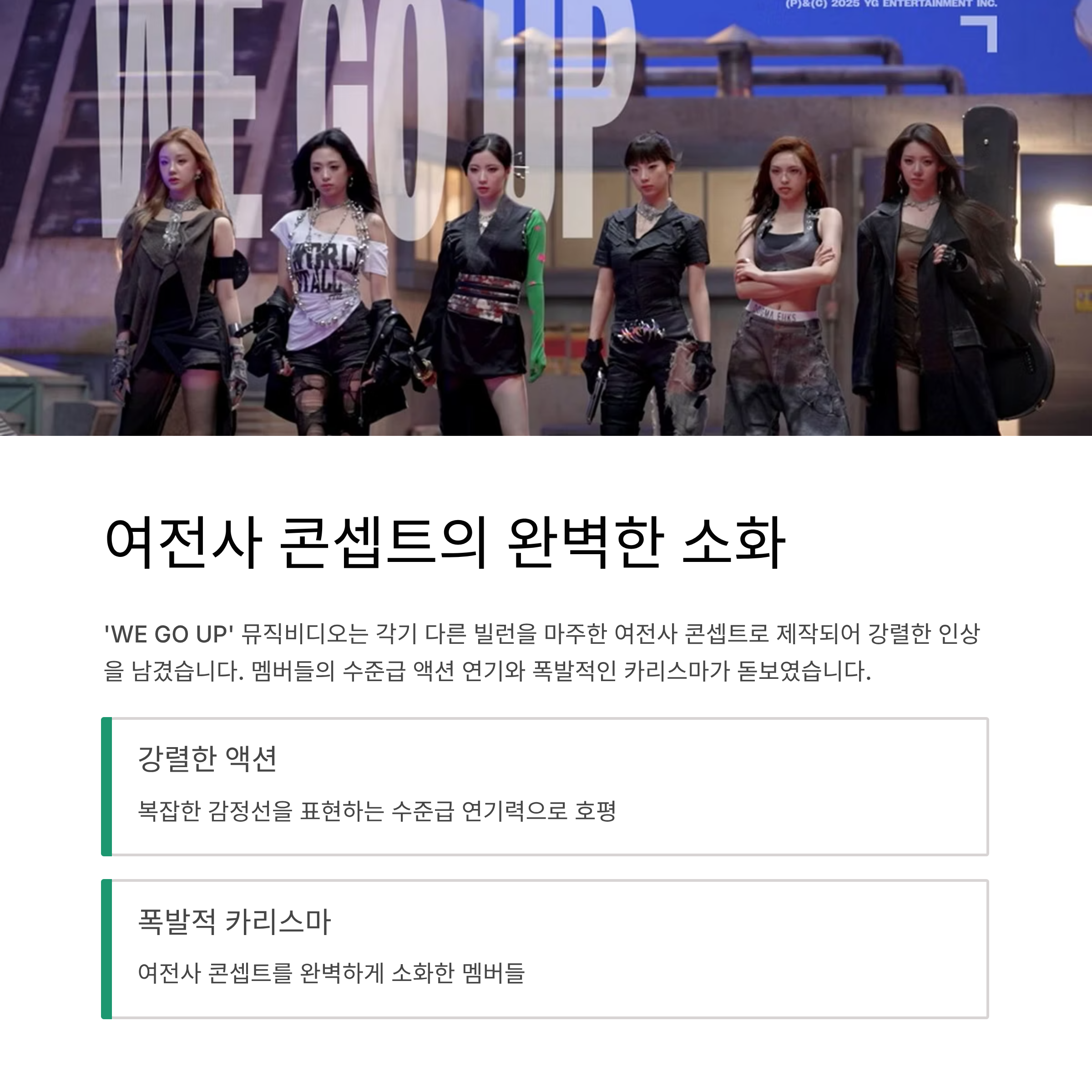 'WE GO UP' 뮤직비디오는 각기 다른 빌런을 마주한 여전사 콘셉트로 제작되어 강렬한 인상을 남겼습니다. 특히 멤버들의 수준급 액션 연기와 폭발적인 카리스마가 돋보였습니다.