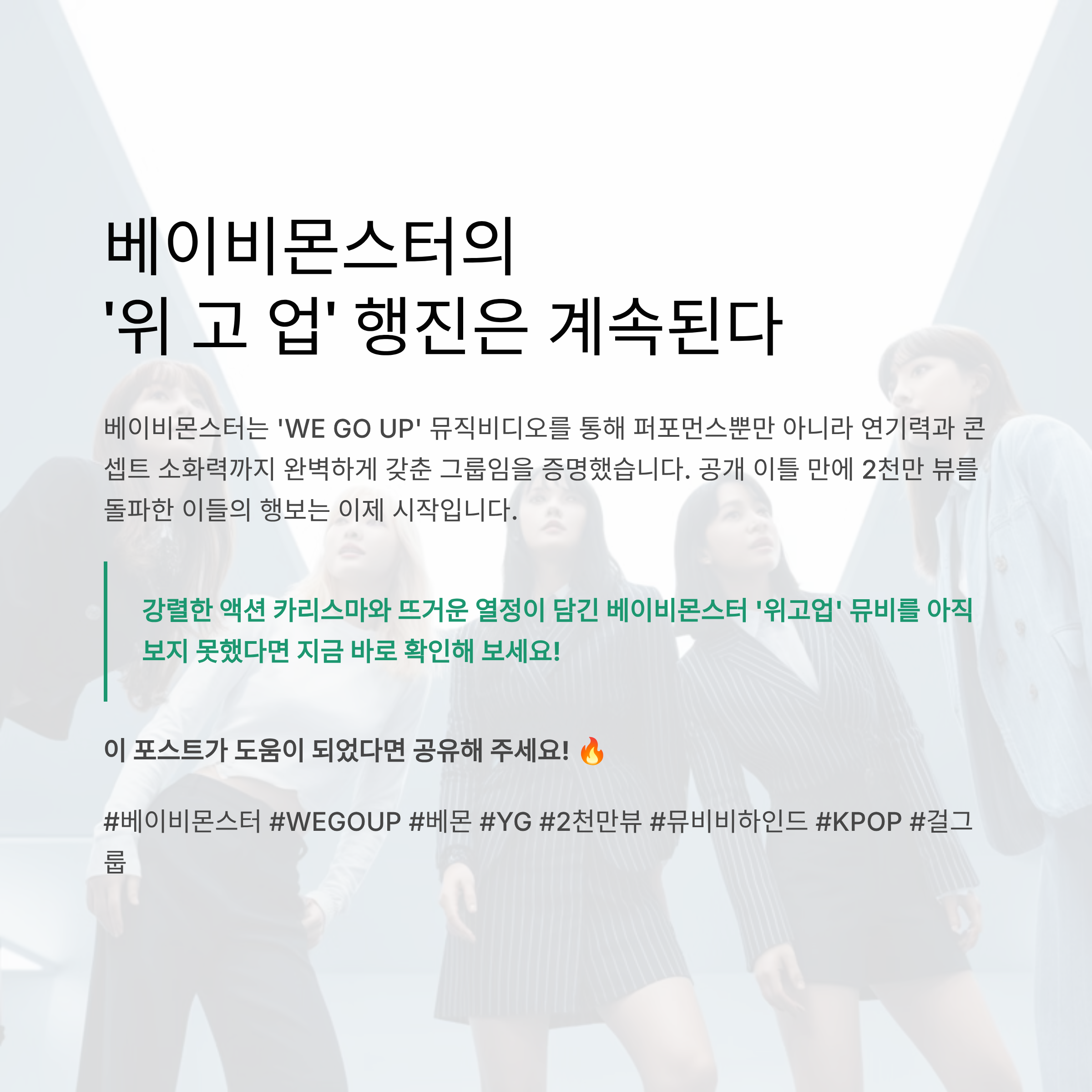 ![[초대박] 베이비몬스터 'WE GO UP' 뮤비, 공개 이틀 만에 2천만 뷰 돌파! (베이비몬스터 위고업 뮤비 비하인드, YG 신인 기록, 액션 카리스마)](https://blog.kakaocdn.net/dna/CTVyn/btsQ6fZsKuh/AAAAAAAAAAAAAAAAAAAAAO7_yqXKhpP6iq5pRbizhJ_HV7rwZIc0YqtzkcdFhL-r/img.png?credential=yqXZFxpELC7KVnFOS48ylbz2pIh7yKj8&expires=1777561199&allow_ip=&allow_referer=&signature=G2eLLijHLkCN3ynuUzb%2BVUDYD1k%3D)